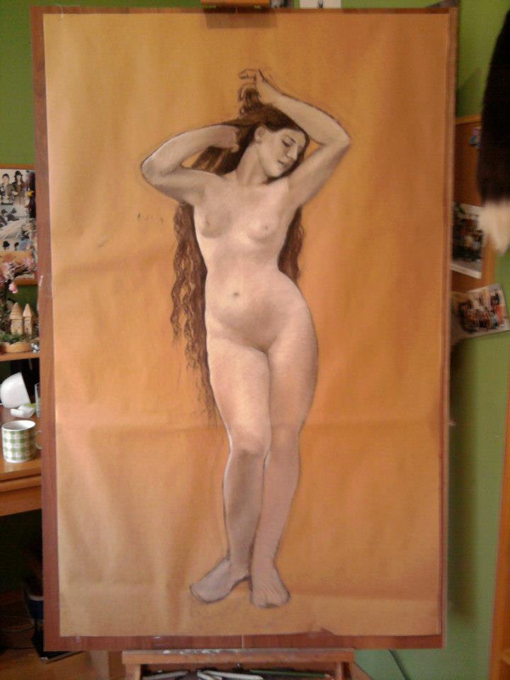 Kresleno podle originálu (Zrození Venuše - William-Adolphe Bouguereau), je to docela velký, tak jsem nechala fotku neořízlou aby byla vidět výška obrazu. Strašně jsem se v tom vyžívala, bohužel tohle je ještě nedodělaná verze (ruce,nohy), dodělanou jsem neměla šanci vyfotit jelikož teď visí v pokoji proti světlu, takže na fotce by bylo prd vidět.